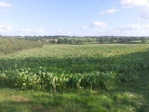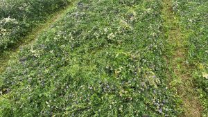 The photo above, taken on 27th July, shows the pure stands of chicory and plantain we planted late May at Foxley. Whilst both established easily, the chicory was quicker and produced a bigger crop. After a cut of haylage in August, the re-growth was grazed by young stock in September. We noticed the cattle preferring to graze the chicory and the plantain prior to grazing the rest of the field, which was planted to our long term FS No 5 ley mixture.